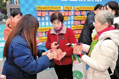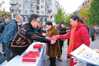 工作人员向群众发放宪法学习读本