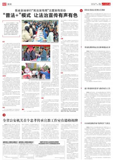 12月4日是第十一个国家宪法日我省各地开展了“普法+汇演”“普法+品牌”“普法+知识竞赛”等多形式宪法宣传活动旨在通过“普法+”模式让群众尊崇宪法、学习宪法、遵守宪法、维护宪法、运用宪法
