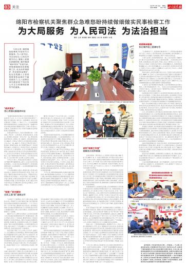 魏玲 兰岚 蒋丽蓉 郭维 梁鹏仓 佘乙萍 赵银熙 文/图 今年以来绵阳两级检察机关坚持为大局服务、为人民司法、为法治担当以执法办案为中心聚焦人民群众急难愁盼