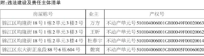 成都市锦江区均隆街18号和东大街芷泉段88号涉嫌违法建设责任主体(详情附清单):你位于成都市锦江区均隆街18号和东大街芷泉段88号的房屋在产权面积外扩建的建(构)筑物,不能出示相关规划审批等合法手续,违反了《中华人民共和国城乡规划法》第四十条之规定。根据《成都市违法建设查处工作规定》,我局已于2024年12月23日发出履行限期拆除违法建设决定催告书,如你(单位、个人)对此有异议,可自公告送达之日起5日内到我局进行陈述申辩,逾期未至视为放弃陈述申辩权利,以我局调查为准,不影响案件的调查和处理。我局将依法作出强制执行决定。