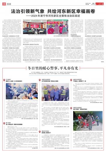 法治之光照亮遂宁市河东新区在这里法治不仅是经济发展的护航者更是居民幸福生活的守护者让新区焕发出和谐宜居的新气象 2024年以来遂宁市河东新区深入学习贯彻习近平法治思想