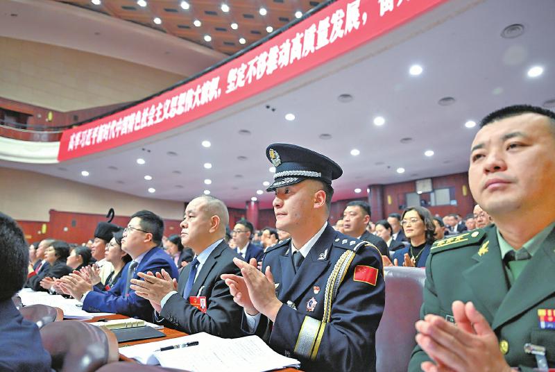 在听取“两院”工作报告时,四郎曲批(右二)为去年我省取得的法治建设成绩鼓掌