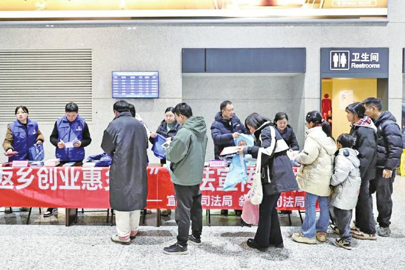 7日,宜宾西站迎来返工客流高峰。宜宾市司法局、宜宾市叙州区司法局普法工作者抓住这一有利时机,在宜宾西站开展一场以“外出务工开眼界 返乡创业惠乡邻”为主题的普法宣传活动。