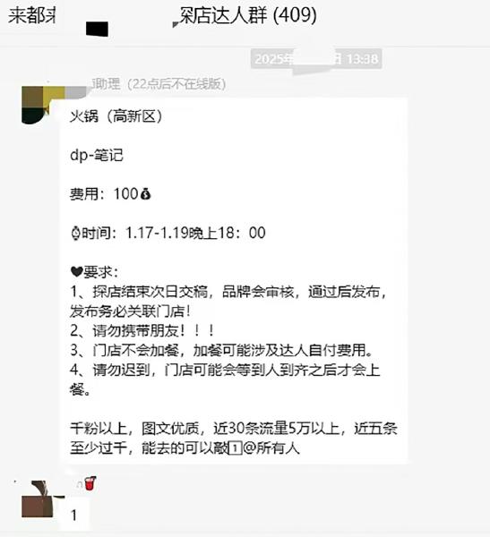 “dp-笔记;费用:100;千粉以上,图文优质,近30条流量5万以上,近五条至少过千,能去的可以敲1”“小红薯合作,费用:200元内自报价;单赞不低于50”“固费220,要求点赞80结款;收藏评论不个位数,配合改稿,配合老板要求发布,达到结案要求才结款,做不到不要来……”这是记者近日在某探店群中看到的几条招募信息。