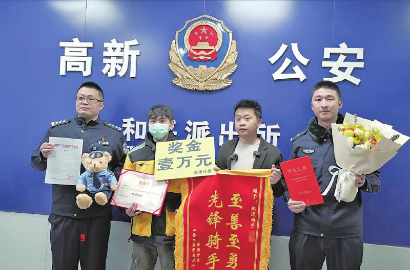外卖骑手小陈(左二)收到奖励和荣誉证书 成都高新公安供图