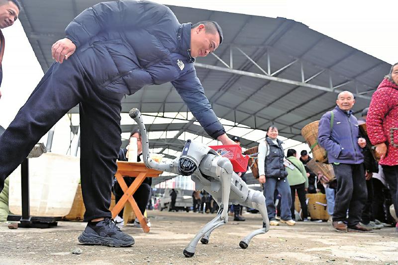 在雅安市名山区红星镇的鲜叶茶叶交易市场里,机器狗的出现吸引了不少茶农、茶商的注意。“得不得咬人哦?”“可不可以帮我们背茶叶?”面对着大家的围观,机器狗晃动着身体,挥动着前臂,示意大家看看背上小筐里的宣传资料。机器狗新颖的互动方式,让大家纷纷主动伸手拿取宣传资料。随后,机器狗还给大家来了一个倒立,引来阵阵掌声。