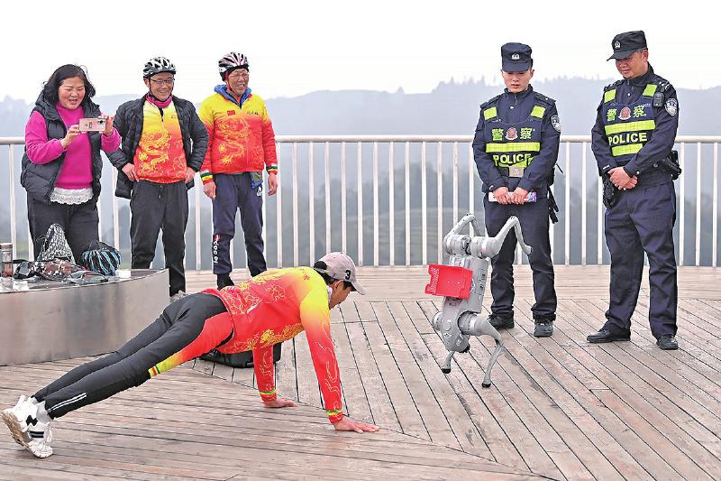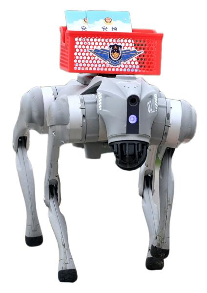 为加强茶园和茶市的安全宣传和秩序维护,雅安市公安局特警支队警务航空大队派出了警用机器狗和无人机。银色的机器狗背着红色的小筐,里面放着反诈、森林防火、交通安全等资料,一边“吆喝”着反诈防骗知识,一边迈着小脚奔跑在茶园小道上。它和茶农“卖萌”握手,坐起来“鞠躬”,还和路边的小奶狗比赛“跑步”。