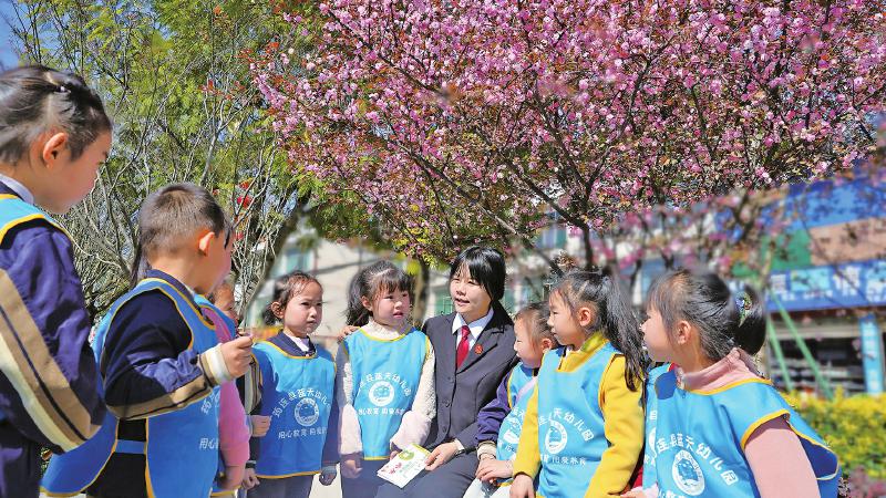 阳春三月,微风和煦,万物复苏。25日,一群可爱的小朋友在老师带领下手拉着手走出幼儿园,去感受春天温柔的气息。筠连县法院两名女干警来到他们身边,在孩子们幼小的心田播种下法治启蒙的种子。面对一张张稚气的小脸,法院干警结合小朋友们的年龄特点和兴趣爱好,通过提问互动等方式,用通俗易懂的语言为小朋友们讲解如何正确识别、预防和处置侵害行为,介绍交通安全、防溺水、防拐防骗等安全知识。沐浴在“吹面不寒杨柳风”的春风中,小朋友们听得津津有味,争先恐后地回答问题,在轻松愉快的氛围中,一定程度上提高了他们的自我保护能力。
