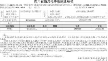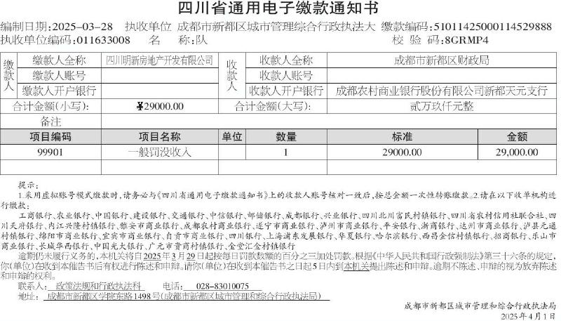 缴纳罚款人民币29000.00元(大写:贰万玖仟元整)。缴款方式:按规定程序将罚款缴至成都市新都区财政局非税专户,交款方式为:手机或网站登录银行账号后,搜索“非税收入缴款”,输入缴款编码“51011425000114529888”并进行交款(具体信息查见《四川省通用电子缴款通知书》)。