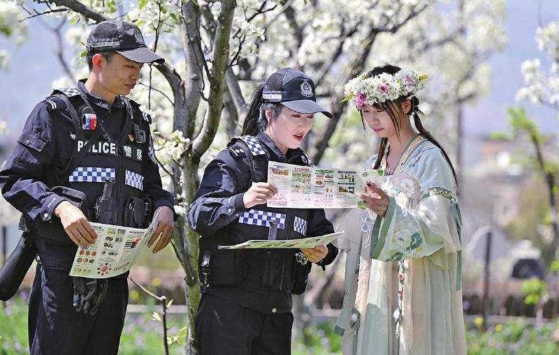 汉源公安设置执勤点3个,日均组织10名警力在九襄花海果乡景区开展交通疏导、分流和停车指引。针对赏花月车流高峰,采取“潮汐车道+临时停车场”模式缓解停车位不足情况,利用“两微一抖”发布旅游线路和温馨提示,引导游客合理规划时间、路线,安全游玩。严打违法犯罪,特别对涉及景区的案件做到快侦快破、快查快处。汉源公安加强与汉源县交通、文旅部门联动,协同查处非法揽客、违规经营等扰乱旅游治安秩序的违法活动。积极向游客宣传防火、防盗、防诈骗、交通事故等安全知识,主动为游客提供帮助,提醒游客注意贵重物品保管及游玩时注意安全,有需要可以随时求助景区警务室执勤民辅警。汉公宣 四川法治报全媒体记者 张磊 杨棕贤 摄影报道