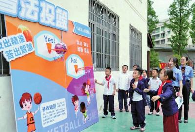 第一关,团队竞技项目。由北山小学学生组成的11支队伍,通过“单脚跳”接力赛比拼速度,到达终点后限时回答网络安全法律问题,题目均来自现场播放的法治宣传视频,既考验体能,又强化记忆。第二关,以“我爱学法”为关键词,展开加字挑战。5支队伍需协作扩展完整法律名称,通过头脑风暴深化对宪法、网络安全法、未成年人保护法等法律的理解,游戏要求逻辑严谨兼具创意,展现法律学习的趣味性与实用性。第三关,篮球竞技与情景模拟结合。参赛学生投篮成功后,需针对网络安全案例提出解决方案。