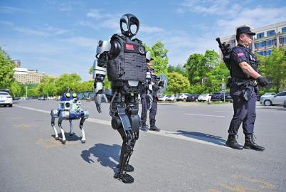 27日上午,绵阳街头,一个警用人形机器人和一只机器狗跟随着绵阳市公安局科技城新区分局的民辅警一起巡逻,为市民带来满满的科技感和安全感。