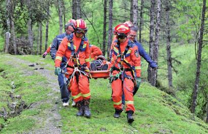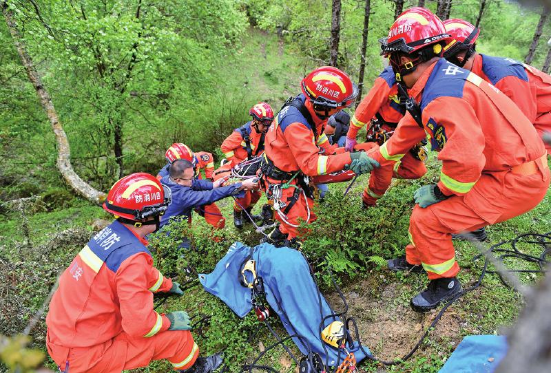 “游客失足受伤,赶紧联系救援队伍!”14日上午,在雅安市宝兴县,一场山地救援实战拉动演练正在开展。演练模拟一名游客在夹金山游玩时不慎失足受伤,失去行动能力,急需救援。