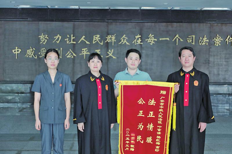 本报讯(甘祝德 四川法治报全媒体记者 雍剑波 文/图)13日,当事人田某某的委托代理人来到广安中院,将印有“法正情暖、公正为民”的锦旗送给广安中院行政庭法官,表达他由衷的谢意。据悉,田某某涉及的是一起工龄认定行政确认案件,因“身份乌龙”,让他工龄认定陷入了僵局。