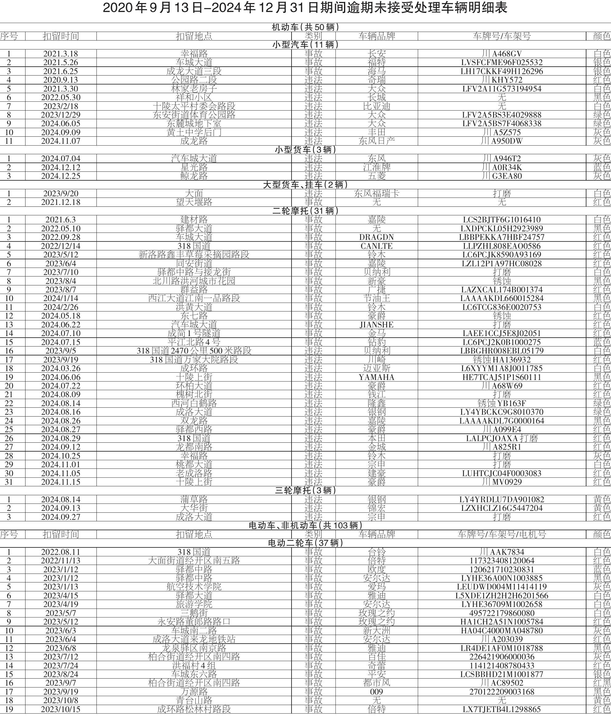 以下机动车、非机动车(合计153辆)的车主或驾驶人请自公告之日起三个月内到我分局接受处理,并提供车辆的合法证明。逾期仍不前来接受处理,或未向我分局提供合法证明的,我分局将依法移送拍卖或报废,所得价款上缴国库。 成都市公安局龙泉驿区分局 2025年5月27日