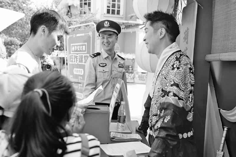 近日,成都市公安局金牛区分局西华派出所联合成都欢乐谷国潮文化节,创新推出“沉浸式反诈科普日”活动,以“国潮+反诈”新模式筑牢群众安全防线。活动中,派出所民辅警化身为古代捕快,创新开展情景互动环节,让游客沉浸式了解反诈科普知识。此次反诈科普的创意新呈现,不仅传承了中华优秀传统文化,又实现了“公安-园区-游客”三维联动深层对话,打造了“可感知、有温度、接地气”的反诈宣传新模式。四川法治报全媒体记者 周夕又 成都金牛公安供图