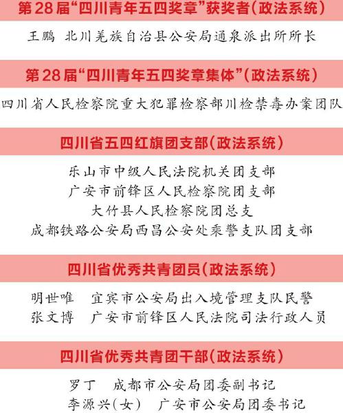 本报讯(四川法治报全媒体记者 王晗阳)经省委功勋荣誉表彰工作领导小组批准,近日,共青团四川省委、四川省青年联合会启动2025年“四川青年五四奖”表彰工作,经推荐、评审、公示等程序,评选产生四川青年五四奖章获奖个人20名、获奖集体10个,四川省五四红旗团委45个、四川省五四红旗团支部45个、四川省优秀共青团员94名、四川省优秀共青团干部86名。其中,全省政法系统5人、5个集体获得表彰。(名单如下)