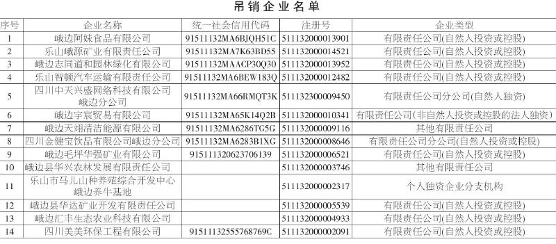峨边市监清吊处字﹝2025﹞1号峨边阿妹食品有限公司等14户企业:
