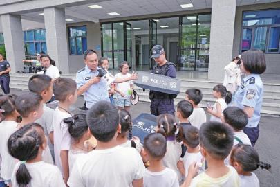 在民警的带领下,学生们首先走进执法办案管理中心参观,民警用通俗易懂的语言讲解警方如何依法办案,尤其强调了法律这把“大伞”如何为保护小朋友撑开。紧接着,指挥大厅的大屏幕亮起,密布的“天网”监控画面让学生们瞪大了眼睛,专职指挥长详细介绍了遇到危险时如何快速准确报警。交通安全知识宣传片吸引了全场的目光,民警将交通规则巧妙融入日常生活情景,安全出行的种子在学生们心中悄然播下。反诈宣传环节,民警用生动的案例为学生们拆解诈骗人员的“套路”。活动必不可少的无疑是装备展示区。在特警队员手把手的指导下,学生们近距离观察、触摸无人机等守护平安的“神器”,兴奋之情溢于言表。