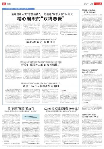 一边和现任女友许诺“恋爱经费”, 一边和网恋女友画“买房大饼”最后还盯上了网恋女友的14万元购房预算一男子由此上演了一出“租车偷包”的戏码…… 38岁的钟某某是个“恋爱多面手”