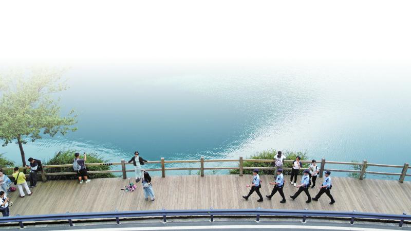 6、执勤民警们沿老虎海木质栈道稳步前行,守护景区安全,碧蓝的海子与民警的藏蓝制服相映成辉