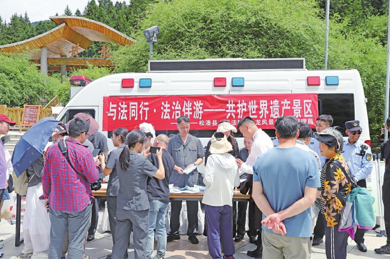 在与游客们的互动中,法院干警发放《旅游法律指南》《生态保护法规图解》等手册。这些采用环保纸张印制的普法宣传资料,成为游客争相收藏的“法治伴手礼”。杨叔龙 张楚 四川法治报全媒体记者 王焰 摄影报道