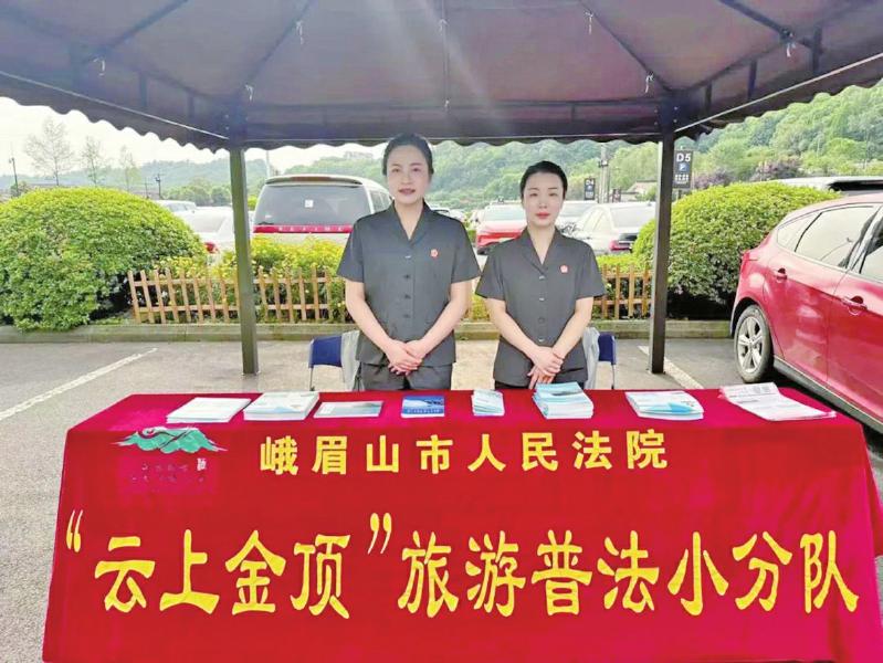 “在景区乱刻乱画会面临什么处罚?”“购买濒危野生动物制品有什么后果?”“如果在山上游玩途中遇见纠纷可以拨打我们的服务热线。”……今年五一假期,天刚蒙蒙亮,峨眉山下黄湾游客中心前已是人影攒动,“徒步峨眉山”成为热门路线。为保障游客“行之顺心、游之舒心、娱之开心”,峨眉山市法院“云上金顶”普法小分队的青年干警们在此驻守,向过往游客发放“云上金顶”法治连环画、游客法律援助手册、旅游纠纷普法案例等宣传资料,提醒其注意防范相关法律风险。