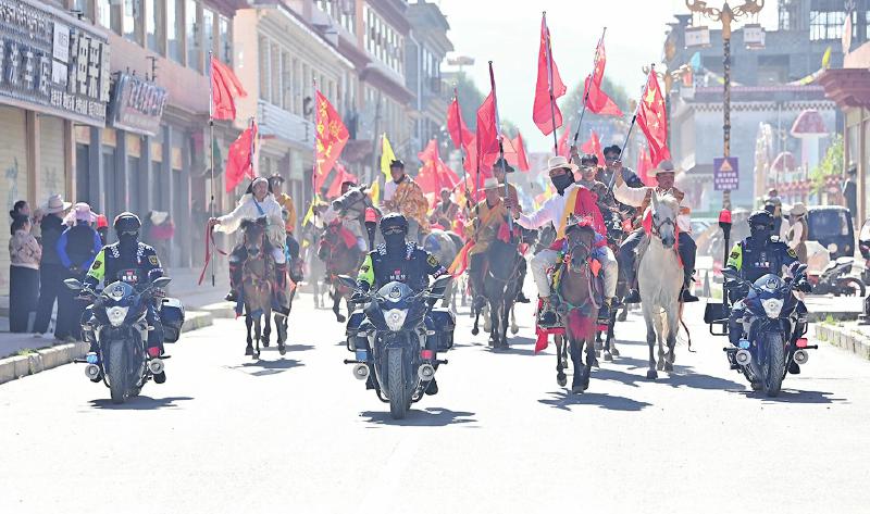 前一天,作为赛马文化旅游季的一项重要活动,“甜野男孩”丁真率队骑马巡游理塘。丁真身着盛装,骑着装饰精美的骏马,引领着马队缓缓前行。巡游马队所到之处,欢呼声、喝彩声此起彼伏。康巴汉子们紧随其后,他们精神抖擞,展现出藏族儿女的豪迈气概。巡游马队浩浩荡荡,沿着理塘的街道前行,仿佛一幅流动的民俗画卷,让游客们大饱眼福。为确保巡游活动的顺利进行,理塘县公安局派出200余名民辅警投入安保工作,为巡游马队和游客保驾护航。