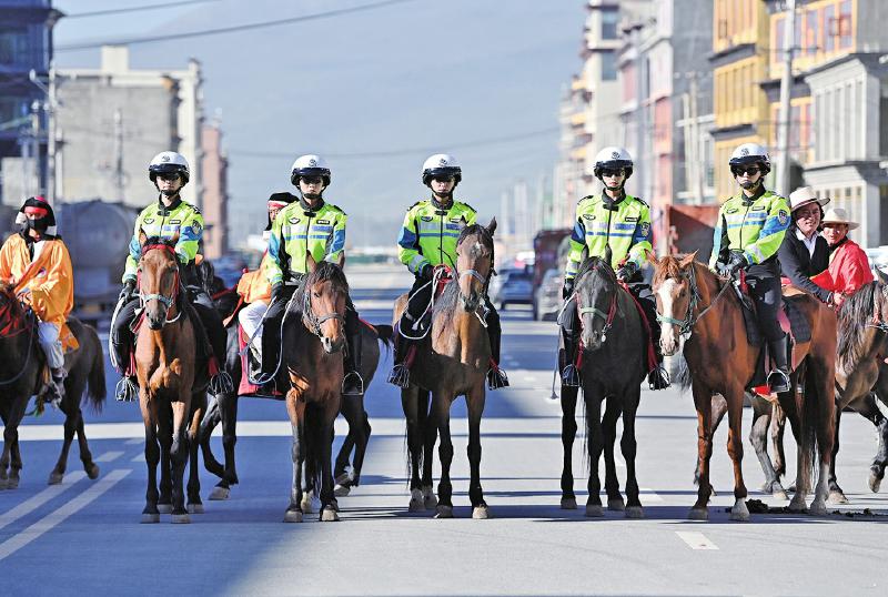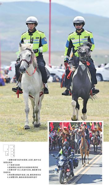 开幕式当天,晨曦微露,被安排在活动现场周边的执勤警力已全员到岗。赛马场周边,交警科学疏导车流,确保道路畅通。赛马场入口处,特巡警与各点位执勤民辅警密切配合,引导群众有序进行安检并入场。在观众席及核心区域,民辅警不间断巡逻值守,时刻关注现场动态,及时回应群众求助。从升旗仪式的庄严肃穆到赛马竞技的激情澎湃,从舞台表演的精彩纷呈到群众互动的欢声笑语。每一个精彩瞬间的背后,都有“藏蓝”身影的默默守护。他们或伫立在烈日下,或穿梭在人群中,用挺拔的身姿维护秩序,用敏锐的目光防范风险,成为开幕式现场一道独特的平安风“警”线。