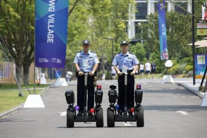 “Where is the dining hall?”(餐厅在哪里?)面对英国运动员的询问,巡逻机器人立即切换英文模式,肚皮上的屏幕弹出导航路线。参赛人员如遇到困难,按下机器人身上的按钮,便可通过视频或语音联通世运村警务站,实时求助民警。机器人的肚子上装有的屏幕还循环播放着中英双语安全提醒,内容包括出行、食宿、消防、反诈、安全等内容。