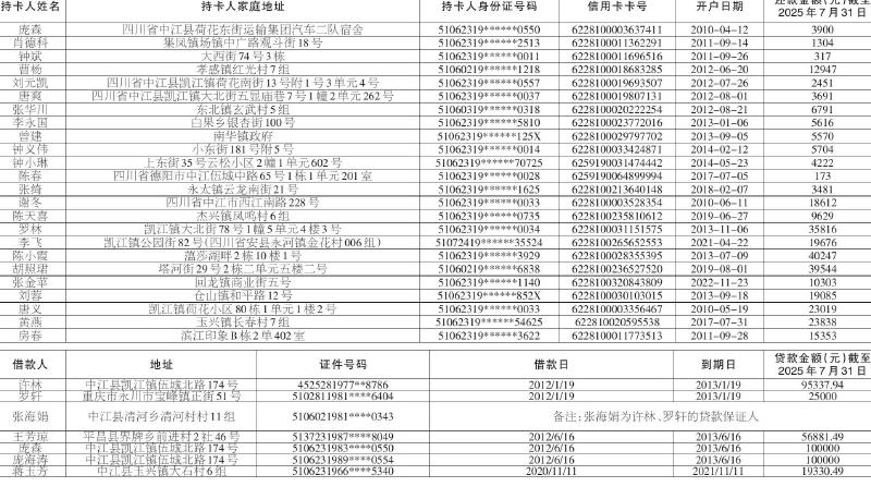 以下债务人(见附表)在我行的贷款到期已久,截至目前仍未归还借款本息,因地址和联系方式变动无法联系到本人,现根据最高人民法院法释(2008)11号的相关规定,对以下债务人所借款本金及相应利息进行公告催收,要求债务人见此公告后速来我行归还本息(利息按贷款合同约定计算)。联系地址:四川省中江县凯江镇铜山大道中段368号 联系电话:08387216508 中国邮政储蓄银行股份有限公司中江县支行 2025年8月8日