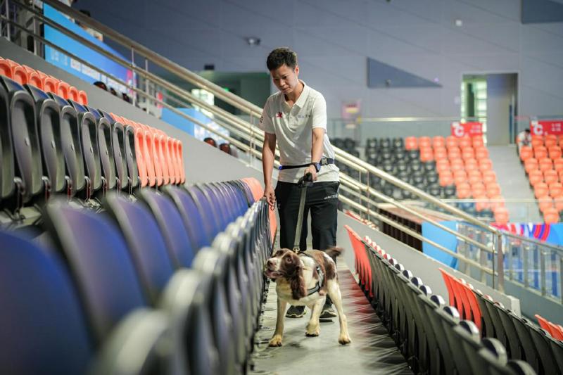 赛事开始的几天前,负责场馆巡护的安保警力就已连续开展每日设施设备排查。雷霆、坦克、黑龙——成都新都公安特巡警大队的三只搜爆犬无疑是场馆里最引人注目的“安全卫士”。它们跟随着训导员的脚步,在观众席的通道间灵活穿梭,鼻尖几乎贴到地面,一抽一抽地捕捉着空气中每一丝可疑的气息。蓬松的尾巴始终保持着警惕的弧线,仿佛一根精准的“安全指针”。从座椅间狭窄的缝隙到房间柜子深处,从媒体区堆叠的器材箱背后到场馆入口的安检通道,每一个容易被忽略的角落,都留下了它们认真探查的痕迹。