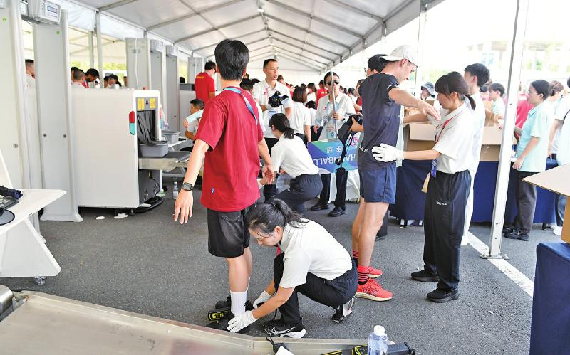 每天清晨,各个比赛场馆安保指挥部的电子屏逐点亮起,安保警力沿着场馆外围开始仔细巡检。烈日炙烤下的安检口,地表温度接近50摄氏度,执勤民辅警的衣服被汗水浸透,但他们仍一丝不苟地核验证件、排查隐患。在赛场核心区,执勤警力用鹰隼般的目光在喧嚣中精准扫描每一处消防设施、疏散通道,用脚步丈量安全底线。酷暑下的场馆外,警用无人机沿着预设路线在高空无死角全覆盖巡航。地面上,造型硬朗的无人巡防车稳稳行进,身形矫健的“机器警犬”在比赛场馆和世运村内巡逻,吸引了众多外国运动员的目光。