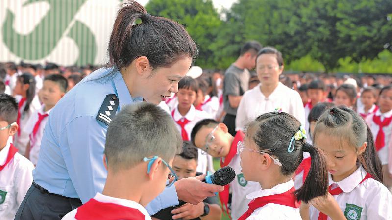 叙永县法院少审庭法官走进叙永镇西外街小学,以生动有趣的普法形式为全校师生开启新学期“第一课”;成都市公安局高新区分局新会展派出所民警陈露走进四川师范大学附属高新区菁蓉小学为同学们讲开学“第一课”,让同学们了解有关校园安全与防范校园欺凌的知识;成都交警二分局全面启动“护学模式”,向辖区学校的学生们讲解步行、乘车、骑车等方面的安全知识。为感谢民警的守护,蒲江县南街小学4名小学生还向蒲江县公安局鹤山派出所民辅警送上特殊礼物:手工制作的贺卡和手工花。