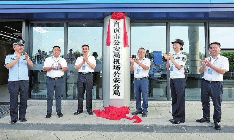 本报讯(王珏 四川法治报全媒体记者 郭建民)8月28日,自贡市公安局机场公安分局在自贡航空产业园正式揭牌成立。自贡市副市长、公安局局长聂海波及自贡市贡井区相关负责人,共同为“自贡市公安局机场公安分局”揭牌。