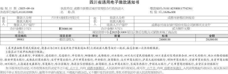 1、警告;2、处以罚款28000.00元(大写:贰万捌仟元整)人民币。自接到本处罚决定书之日起15日内,按规定程序将罚款缴至成都市新都区财政局非税专户,交款方式查见《四川省通用电子缴款通知书》逾期不缴纳罚款的,依据《中华人民共和国行政处罚法》第七十二条规定,将每日按罚款数额的3%加处罚款。