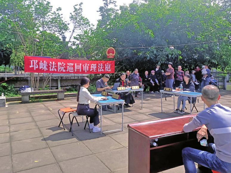 2023年5月17日,邛崃市法院火井法庭在南宝山镇公开审理徐小勇(化名)诉母亲黄花(化名)抚养费纠纷案,40余名村民围坐旁听。法官当庭阐释“非婚生子女与婚生子女享有同等被抚养权”,并依法判决黄花每月负担生活费600元。庭审结束后,村民围着法官咨询婚姻家庭、土地流转等问题,巡回审判现场变身“院坝法律课堂”。
