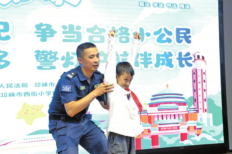 未成年人普法品牌化。2023年9月7日,邛崃市法院联合邛崃市教育局和重庆市第五中级人民法院,围绕校园欺凌、性侵、毒品、网络犯罪等热点,在邛崃市西街小学设主课堂,开展开学第一课主题宣讲。该院“豌豆荚·萤火虫法治宣讲团”成员谢晨以“校园内外侵害多,警灯护航伴成长”为主题,教导同学们如何远离危险、应对危险,并邀请同学们上台示范,教授同学们面对危险时,如何保护自己并进行自救。