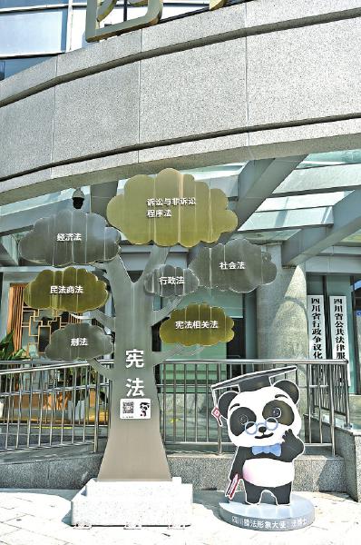刚在四川省公共法律服务中心办完法律咨询服务的老张,一出门就被门前的一只憨态可掬的“熊猫”所吸引,便上前细细观看。这只“熊猫”是四川普法形象大使——“法博士”,与枝干分明的“宪法树”相伴而立,它们构成了花样“上新”后的上翔街法治文化街区的一角。近日,记者走进这一特色街区,探寻市井烟火气中的法治魅力。
