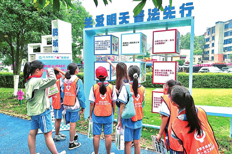 漫步郫都区鹃城法治文化园步道,一个个图文并茂的宣传栏格外醒目。孩子们在欣赏美景的同时,不时驻足阅读,于山水之间接受法治熏陶。