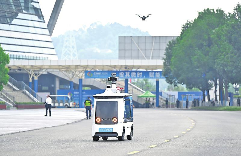 科博会期间,绵阳市公安局特巡警支队在会展中心周边部署11台具有一键报警求助、安全提示、实时图像采集等功能可自主巡逻的警用机器狗,助力民辅警执行智慧巡逻防控任务,更好地服务广大市民。绵阳市公安局交警支队无人巡逻车则作为智能移动安防单元投入应用,实现全天候自动化巡逻。车辆搭载高清摄像头和AI视觉算法,能自主识别道路两侧违停车辆,并实时联动交警系统,通过短信通知车主尽快驶离,实现非现场执法的智能化闭环。绵阳市公安局交警支队还在展馆核心区部署了一套“空中天眼”无人机,其核心功能是进行高空立体化巡逻,实时监控大片道路的交通状况,并通过高清视频实时回传至指挥部,及时发现交通拥堵苗头。此外,绵阳市公安局高新区分局投入3台警用智能机器人,可以在安保现场开展语音安防提示,并采集现场图像数据,对一些场景进行智能分析,为警务工作提供参考。