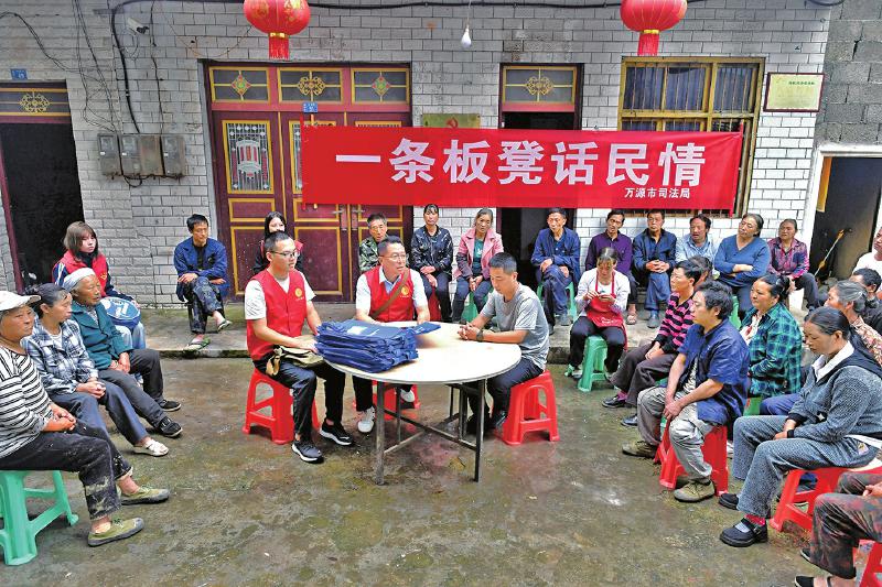 1.万源市司法局挎包服务队队员在“一条板凳话民情”的活动中向群众进行法治宣传