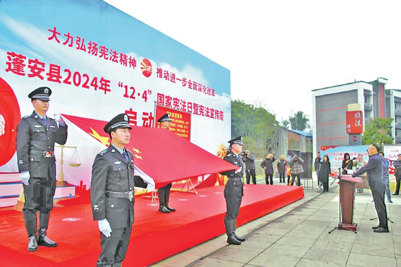 “我宣誓:忠于中华人民共和国宪法,维护宪法权威,履行法定职责……”在2024年“12·4”国家宪法日暨“宪法宣传周”活动启动仪式上,蓬安县委书记唐方春领誓,现场举行了庄严的宪法集中宣誓仪式。参加活动的全体人员整齐列队,面向国旗,右手握拳,庄严宣誓,用坚定有力的誓言表达了对宪法的忠诚和对法治的敬畏,彰显了维护宪法权威、履行法定职责的决心。