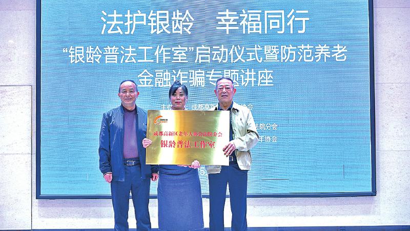 活动中,成都高新区老年人协会会长孙波为“工作室”授牌。孙波表示,该协会将全力支持“工作室”的建设和发展,充分整合各方资源,着力加强统筹协调,推动普法服务常态化、长效化,争取在试点成功的基础上向全区推广,真正把法治关怀送到成都高新区每一位老年朋友的身边。