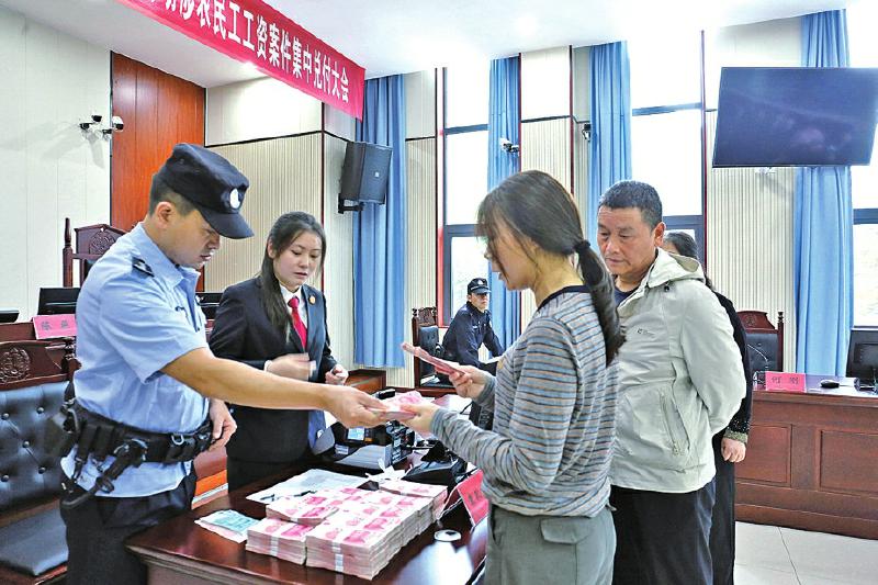 为确保每一笔款项精准发放到农民工手中,广元市利州区法院举行案款集中兑付大会。执行干警逐一核对申请执行人的姓名、身份证号与应发金额,指导大家签字确认,并将案款发放到每一名农民工手中。