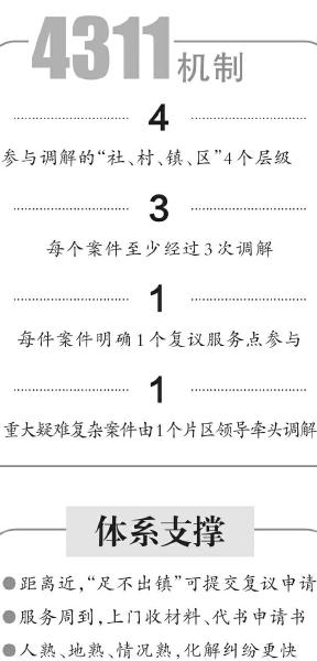 16年积案的化解,不是偶然,而是“4311”行政复议调解机制的必然成效。“4311”这一数字的奥秘在于,“4”是指参与调解的“社、村、镇、区”4个层级,“3”是指每个案件至少经过3次调解,两个“1”分别指每件案件明确1个复议服务点参与、重大疑难复杂案件由1个片区领导牵头调解。