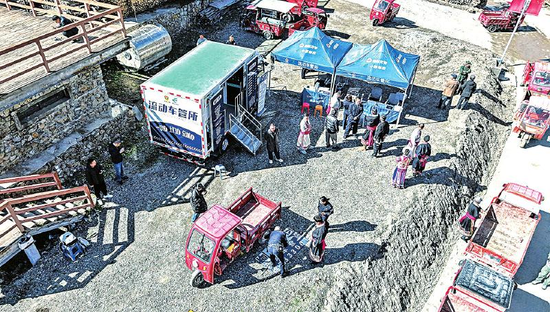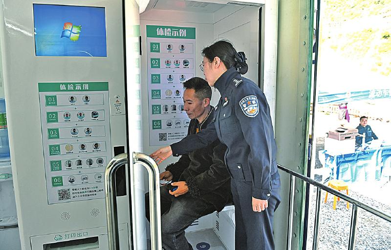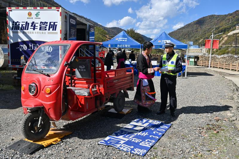 帐篷前的空地上,民警正利用便携式电子称对一辆三轮摩托车进行称重查验。“农村地区有很多这种拉货载物的三轮摩托车,就拿白马镇来讲,以前群众上牌要去80公里外的平武县城的车管所,来回成本高,还耽误时间。许多群众觉得麻烦就不想上牌照了,这也带来了很大的交通安全隐患。”现场民警告诉记者,“现在,我们把车管服务直通车开到村寨里,还带了便携设备对车辆进行现场查验、受理上户业务,群众手续资料齐全的情况下,3个工作日内就能把新牌照寄递到群众家里。如此一来,整体提高了摩托车、电动车的上户率,从源头夯实了道路交通安全基础。”