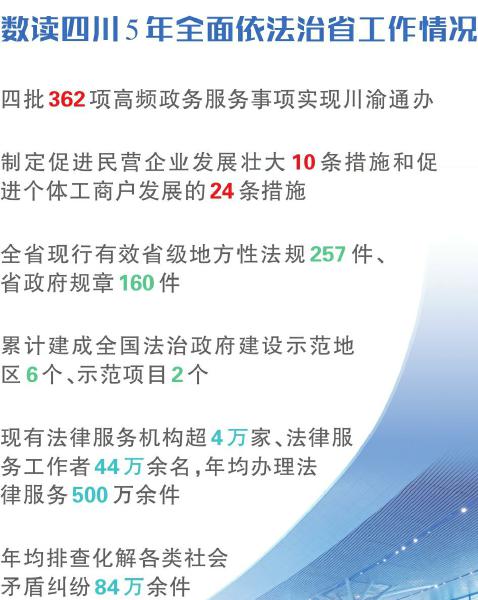 李丹介绍,我省积极推动成渝地区双城经济圈建设,协同出台优化川剧传承保护条例、社会保障一卡通条例等地方性法规,成立长江上游地区生态保护法治联盟,推进川渝交通运输、生态环境等领域行政处罚裁量基准统一,四批362项高频政务服务事项实现川渝通办,法治让川渝融合愈来愈紧。
