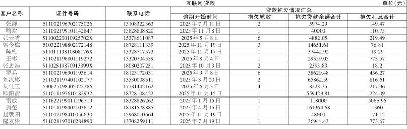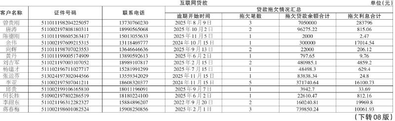 下列附表所列债务人(以下简称“债务人”)与我行签订的《借款合同》项下贷款已逾期。截至本公告发布之日,债务人尚未履行还款义务。现依据债务人与我行签订的《借款合同》和信用卡《章程》之约定,以及《中华人民共和国民法典》等相关法律规定,对以下债务人所欠借款本金、利息、罚息(具体金额以合同约定及实际核算为准)予以公告催收。请各债务人自本公告见报之日起十五日内,速赴我行各营业网点清偿全部债务。逾期仍未履行的,我行将采取包括但不限于提起诉讼、申请强制执行在内的进一步法律措施,以维护我行合法权益。