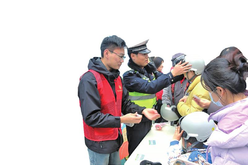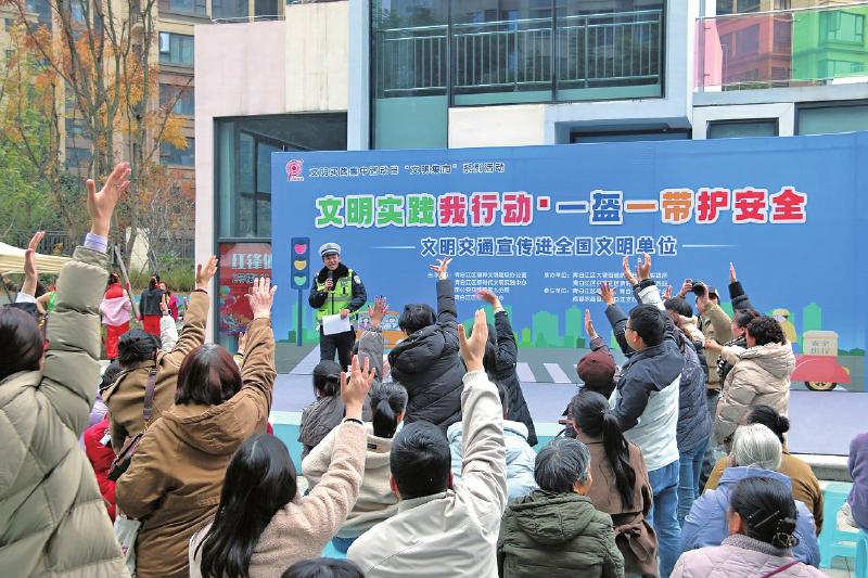 成都交警九分局联合青白江区文明办等部门近日走进“全国文明单位”成都市青白江区大弯街道红峰社区,开展了一场以“文明实践我行动·一盔一带护安全”为主题的文明交通宣传活动。“一盔一带”安全体验区是此次活动的热门打卡点,交警现场示范讲解安全头盔的正确佩戴方法,从系带调节到角度校准,每一个细节都讲解得清晰透彻。居民们纷纷上前体验,在对比中感受佩戴头盔与不佩戴时的安全差异。四川法治报全媒体记者 夏菲妮 成都市公安局青白江区分局供图